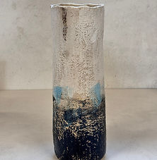 Hoge vaas in zonnige kleuren, slank en rustig van vorm.