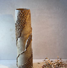 Hoge zoutgestookte vaas met reliëf en een rustige, aardse kleur